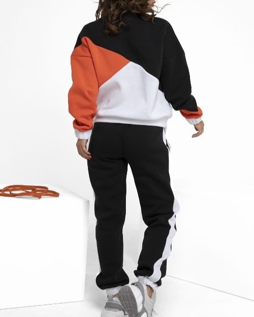Чорний костюм з невеликою блискавкою виготовлений із теплого трикотажу на флісовій підкладці з оранжево-білими вставками.